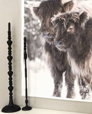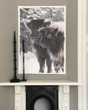 Deze sfeervolle foto toont twee Schotse hooglanders, herkenbaar aan hun imposante hoorns en dichte, lange vacht, die hen beschermt tegen de winterse kou. Ze staan rustig naast elkaar in een besneeuwd landschap, waarbij hun dikke vachten variëren van donkerbruin tot lichtbruin. De rustige compositie van deze afbeelding vangt de robuuste schoonheid van deze majestueuze dieren en de rust van een winterse omgeving. Perfect als decoratie voor liefhebbers van natuur, dieren en winterse taferelen.