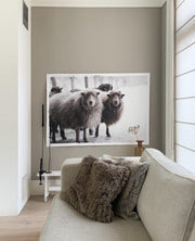 Deze prachtige foto toont een groep IJslandse schapen, met hun dikke, wollige vacht, die hen beschermt tegen de ijzige kou. Een mooi besneeuwd landschap, waar de schapen rustig staan te grazen of rondlopen. Hun dikke vacht varieert van lichtgrijs tot donkerbruin, wat bijdraagt aan de warme uitstraling. Deze afbeelding is perfect voor een rustieke en natuurlijke sfeer in huis, ideaal voor liefhebbers van natuur en dieren.